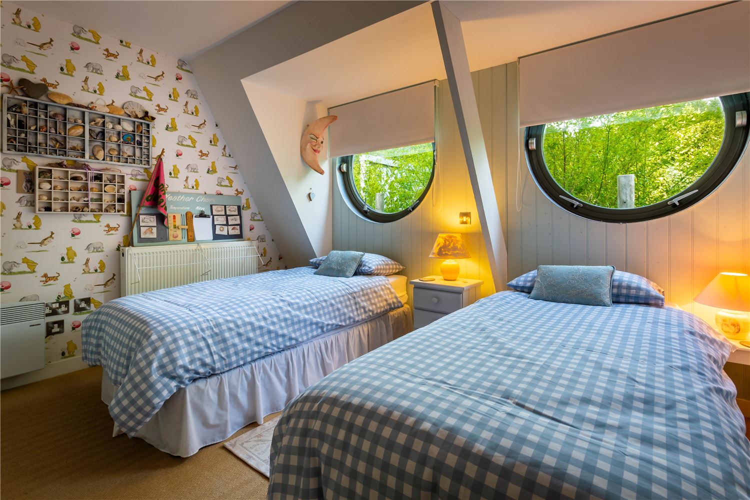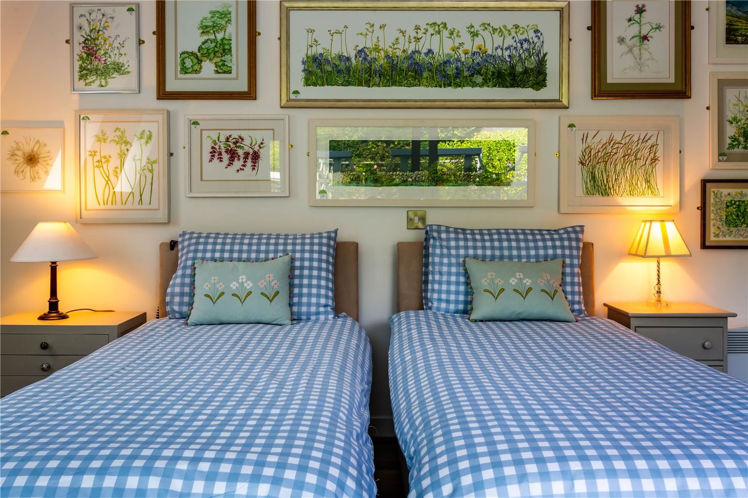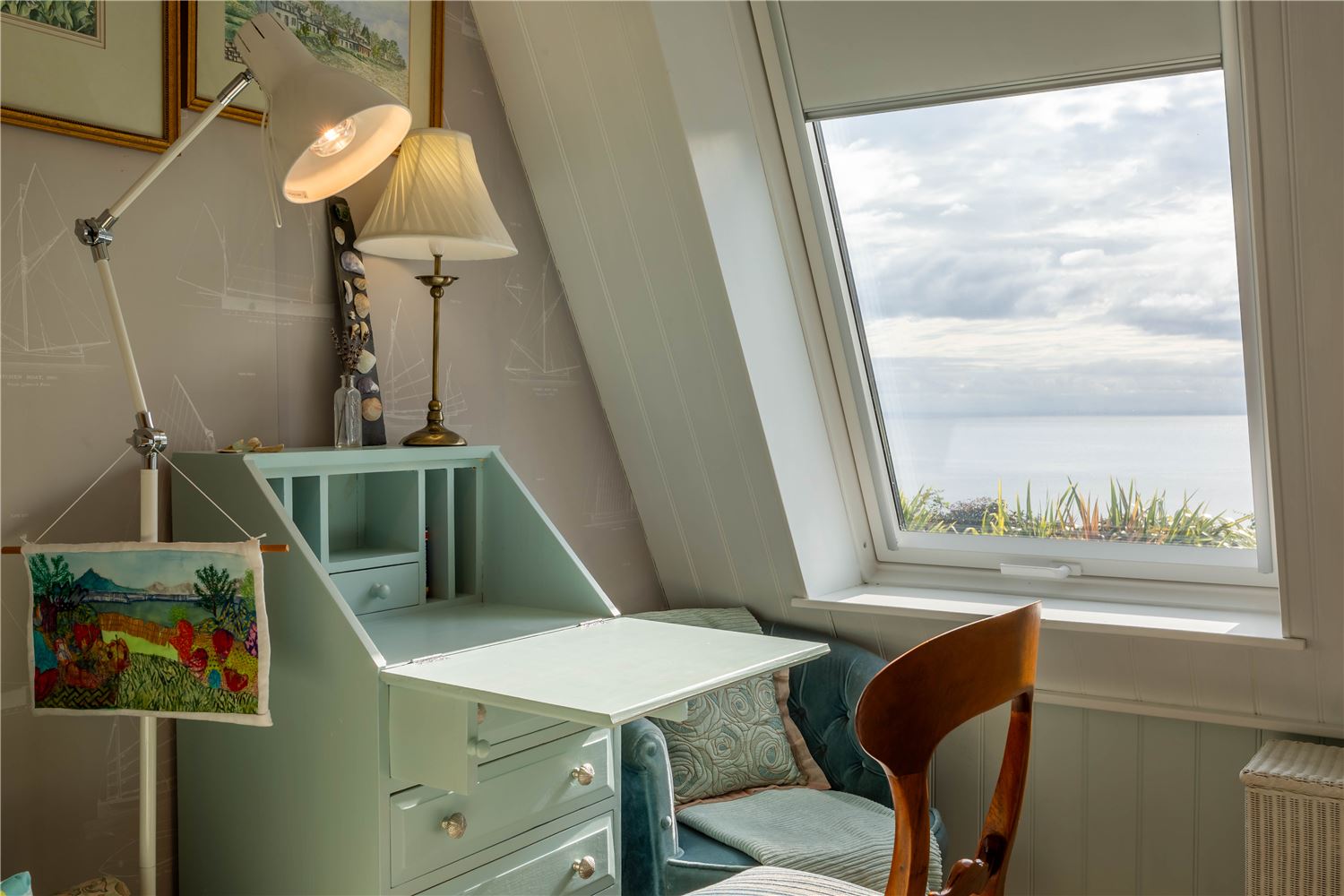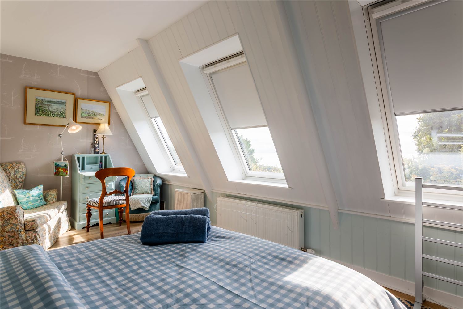 Off the sitting room lies a beautiful family suite, featuring a spacious double bedroom with a study area and sofa, and a charming twin room — both reflecting the home’s seaside character through soft tones and natural textures. They share a contemporary bathroom with a bath and separate shower, offering both style and practicality.