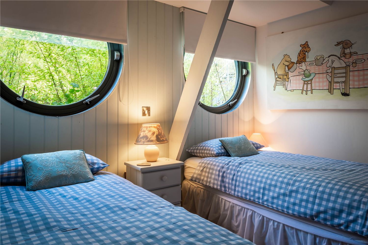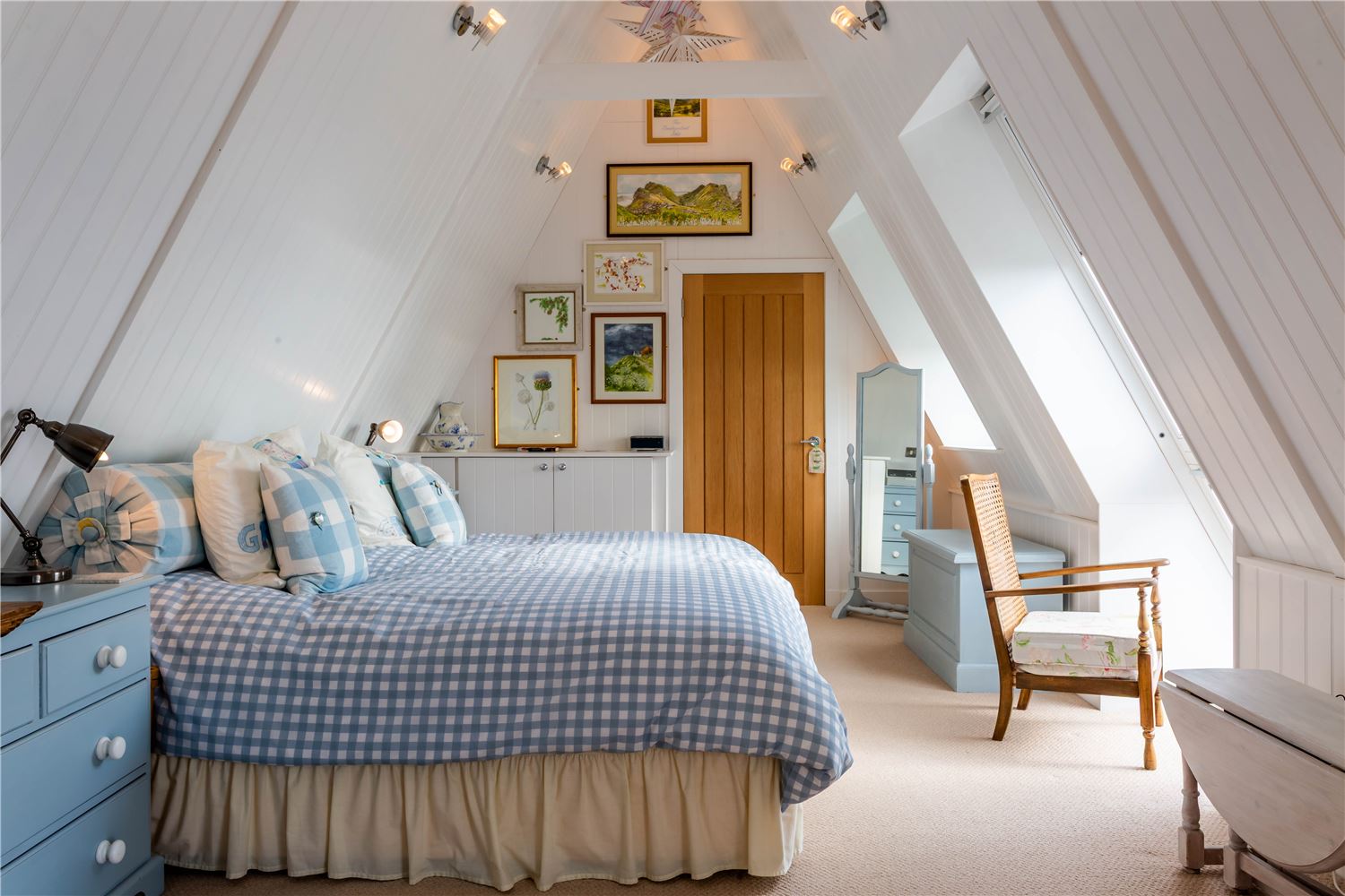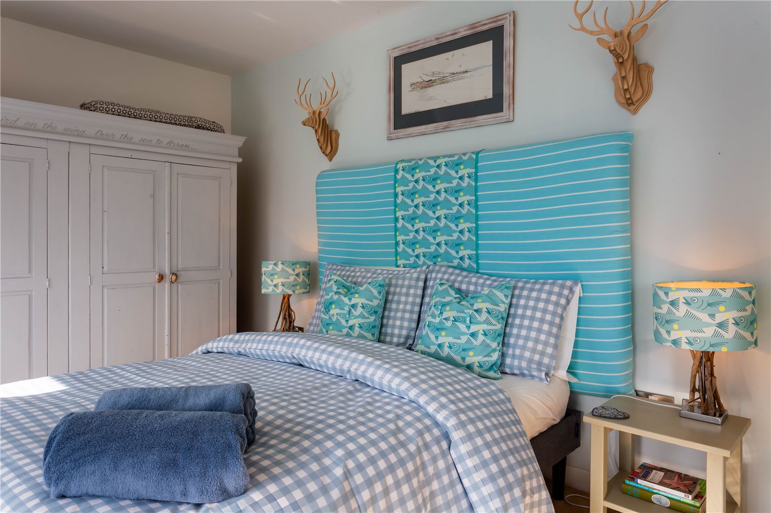 Off the sitting room lies a beautiful family suite, featuring a spacious double bedroom with a study area and sofa, and a charming twin room — both reflecting the home’s seaside character through soft tones and natural textures. They share a contemporary bathroom with a bath and separate shower, offering both style and practicality.