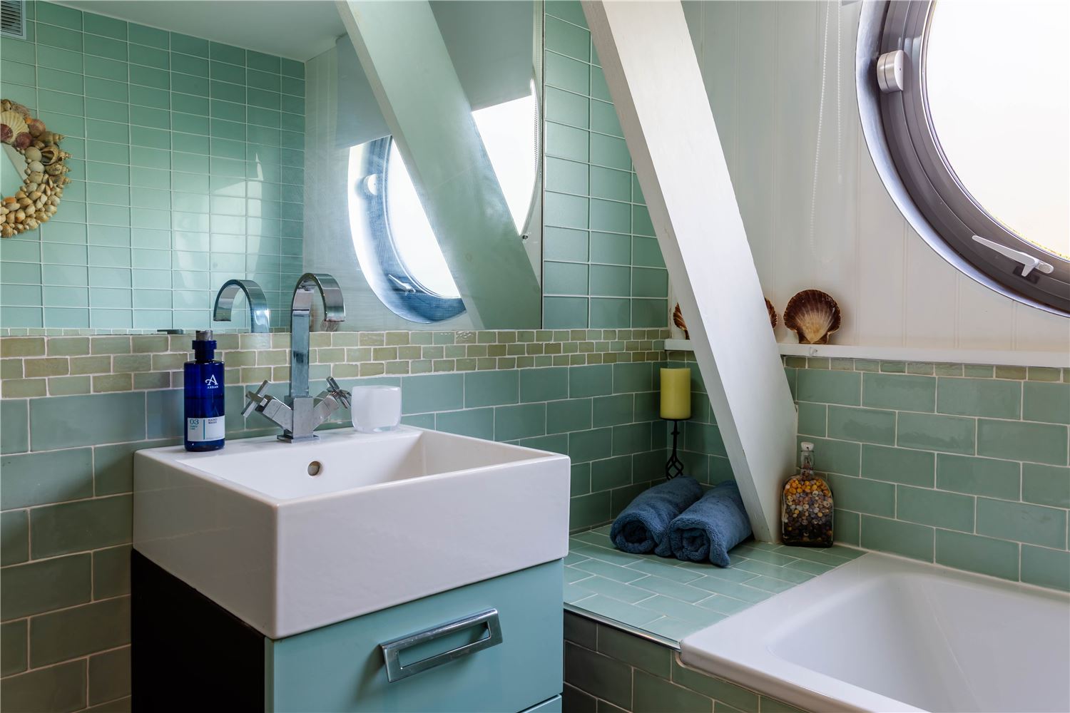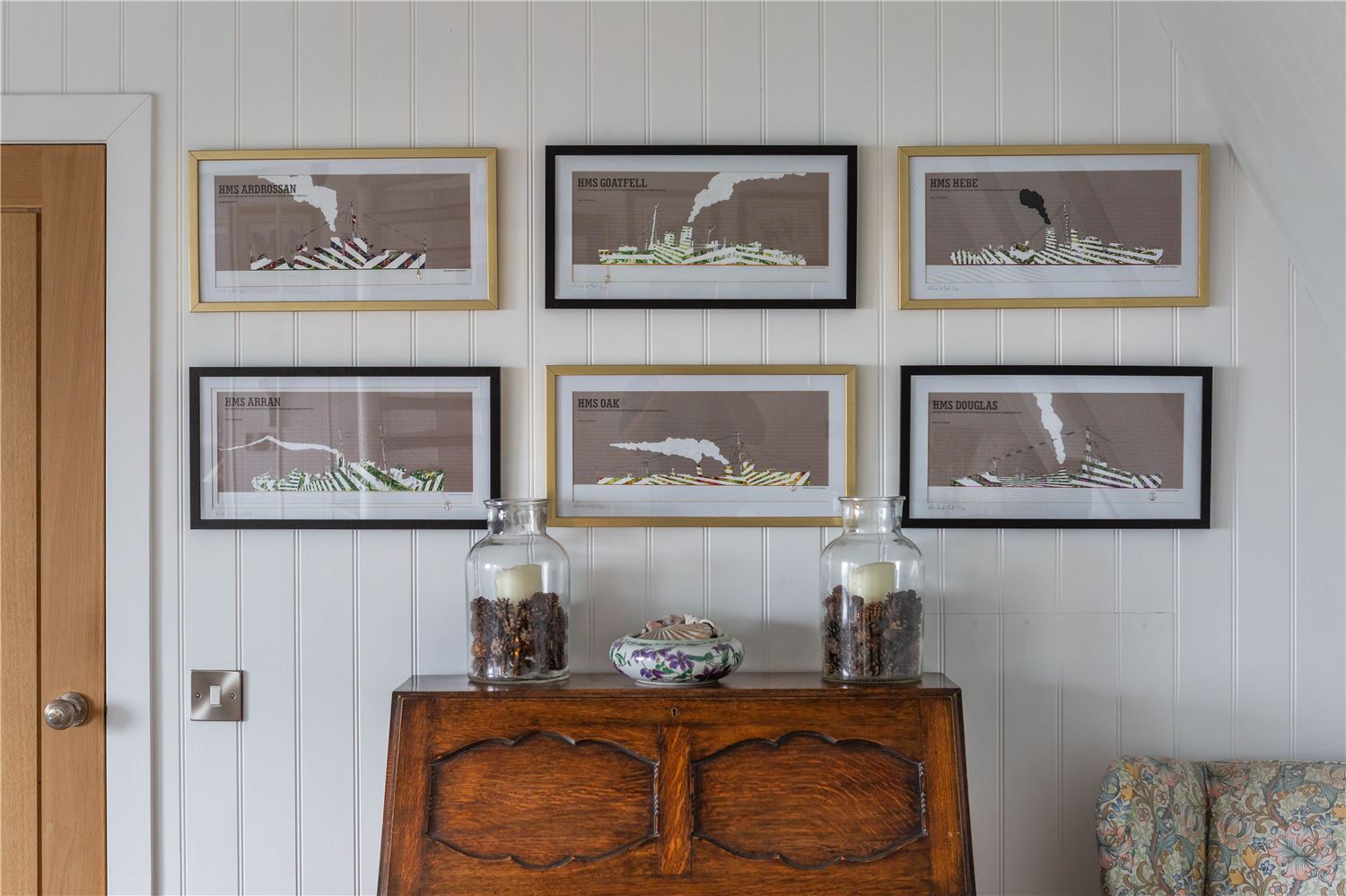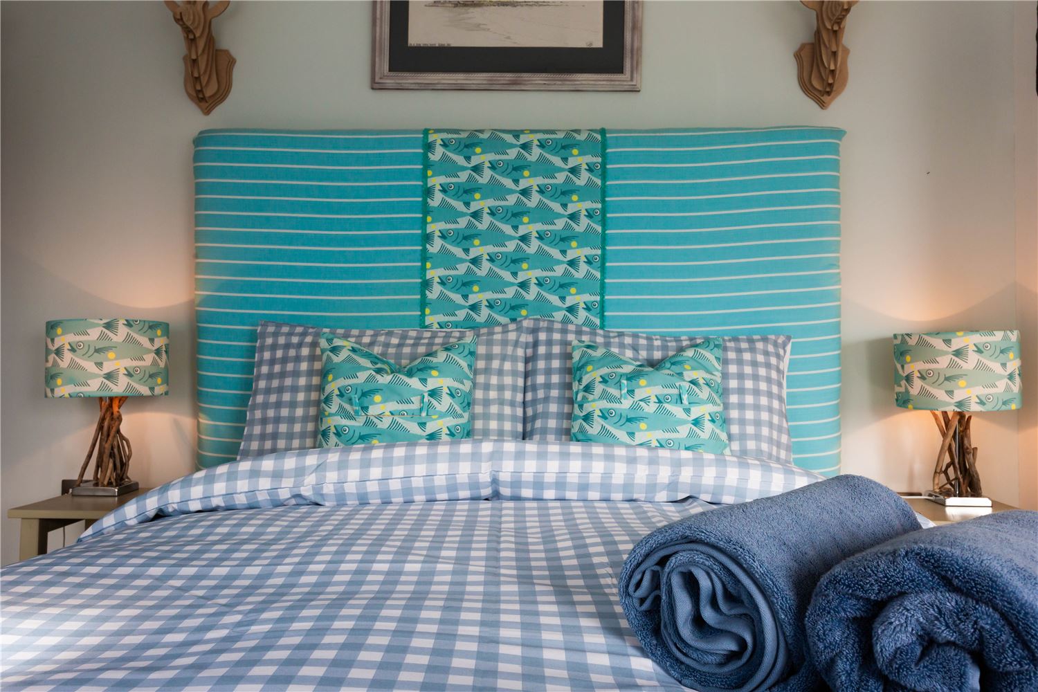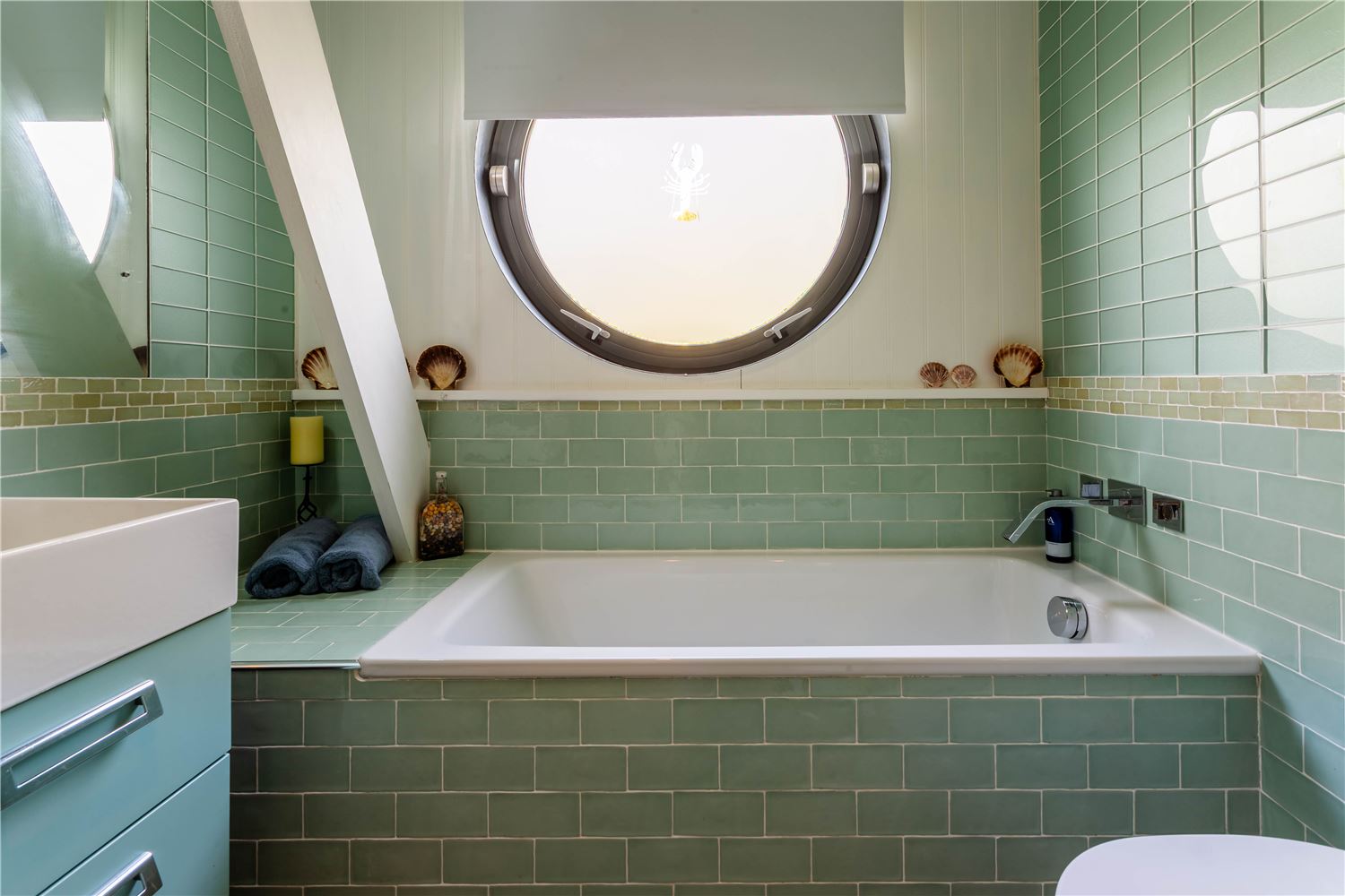Off the sitting room lies a beautiful family suite, featuring a spacious double bedroom with a study area and sofa, and a charming twin room — both reflecting the home’s seaside character through soft tones and natural textures. They share a contemporary bathroom with a bath and separate shower, offering both style and practicality.