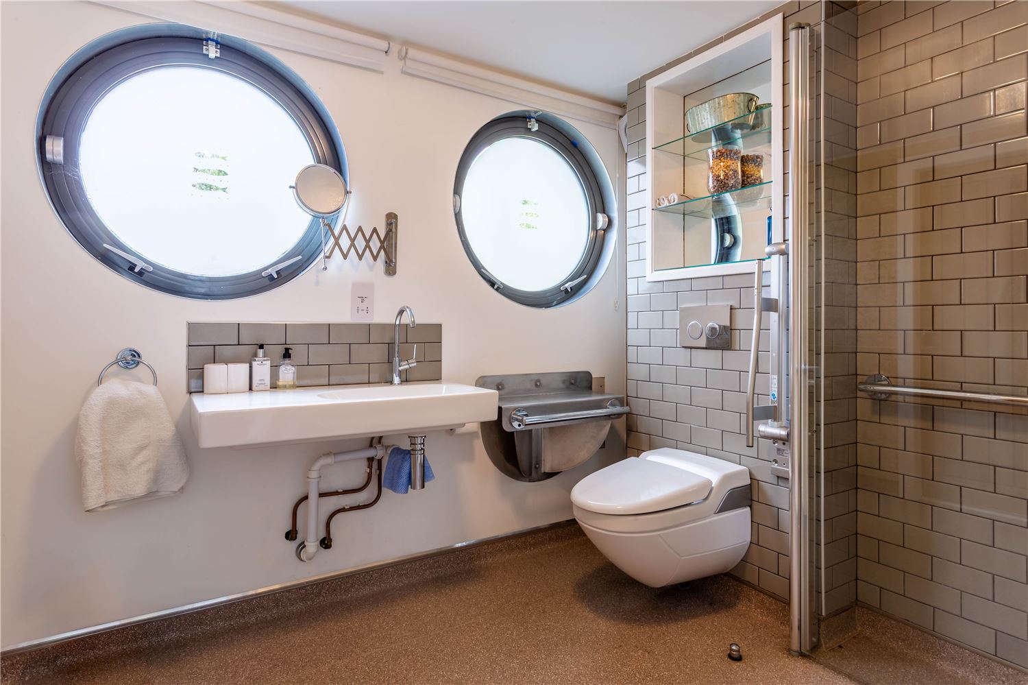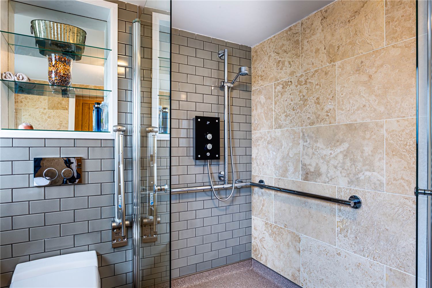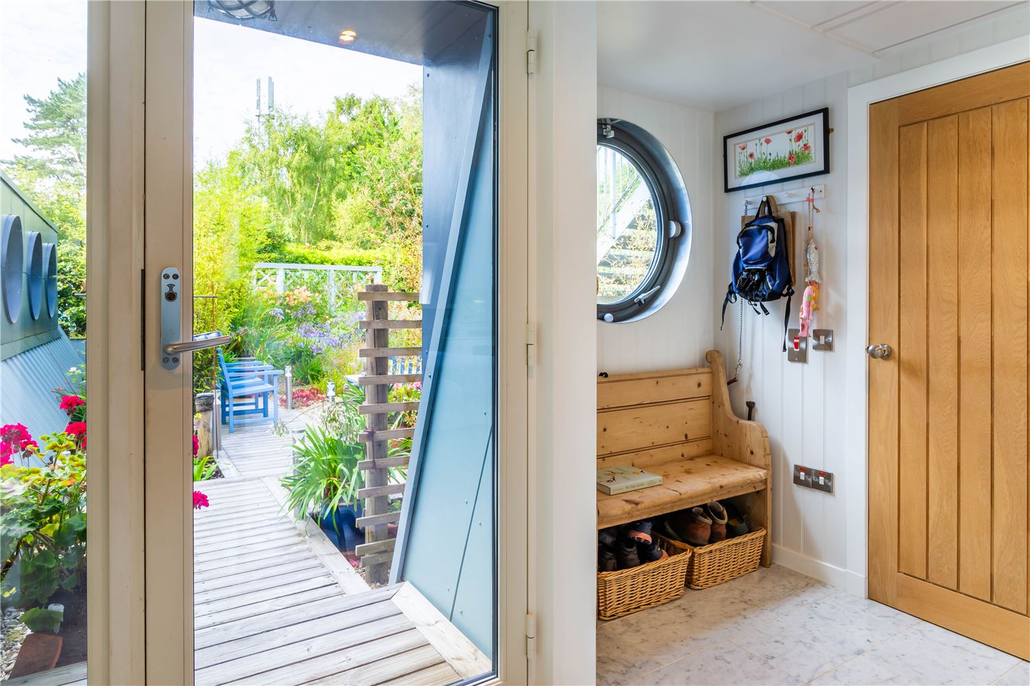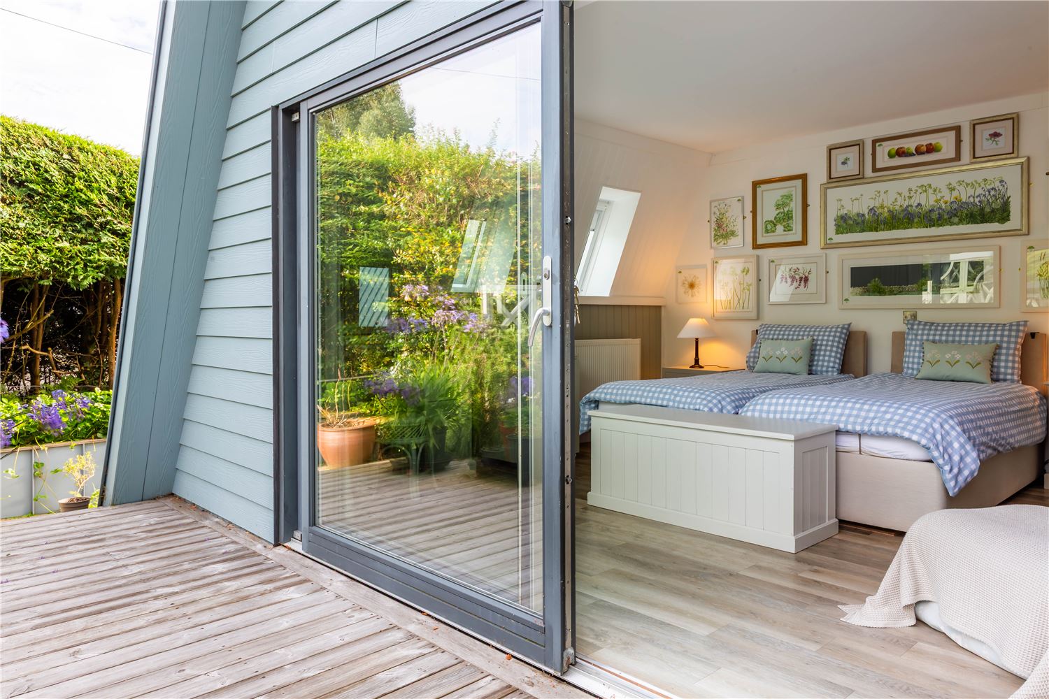 Also on the ground floor is a fully accessible double bedroom, designed with inclusivity and comfort in mind. Both beds are electrically adjustable, and the en-suite wet room offers grab rails and a no-step shower. Large sliding doors open directly to a private deck overlooking the peaceful rear courtyard garden, a sheltered spot to enjoy the late afternoon sun.