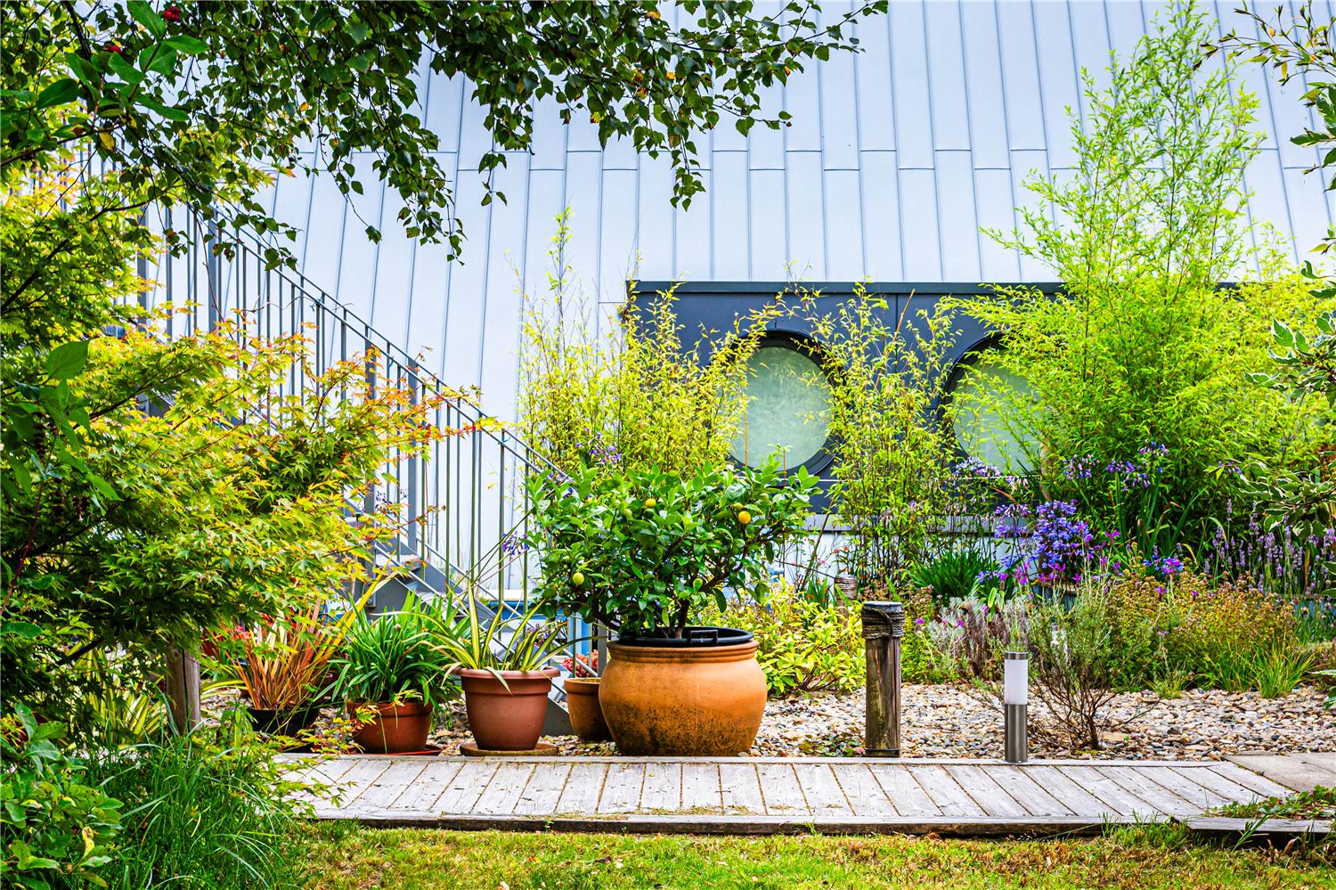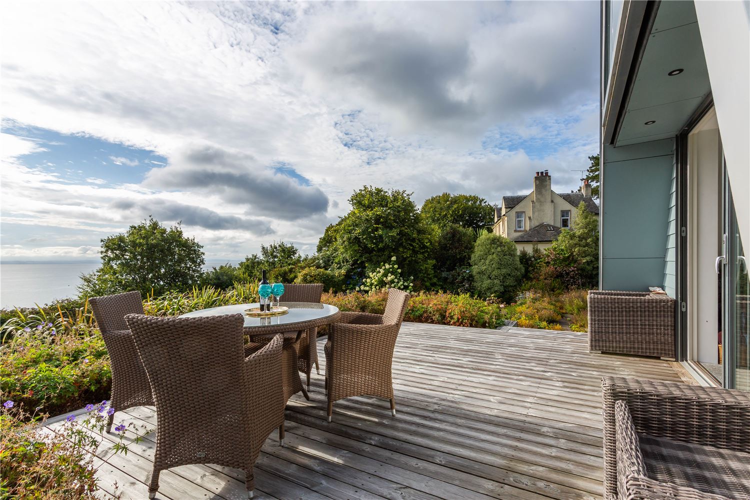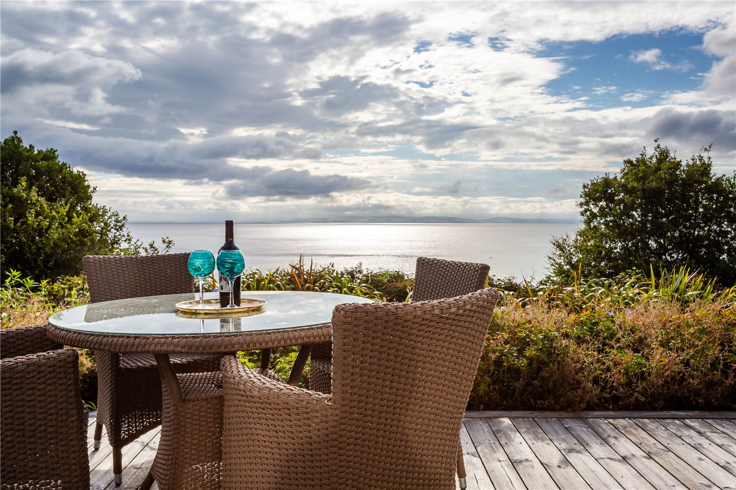The beautifully landscaped grounds at Ad Astra are a true highlight, wrapping seamlessly around the holiday home and offering a variety of peaceful spots to enjoy the stunning surroundings. The front courtyard garden, designed to evoke the charm of a traditional harbour, is a perfect place to unwind. As the evening sun sets, this tranquil spot becomes the ideal place to relax with a glass of wine.