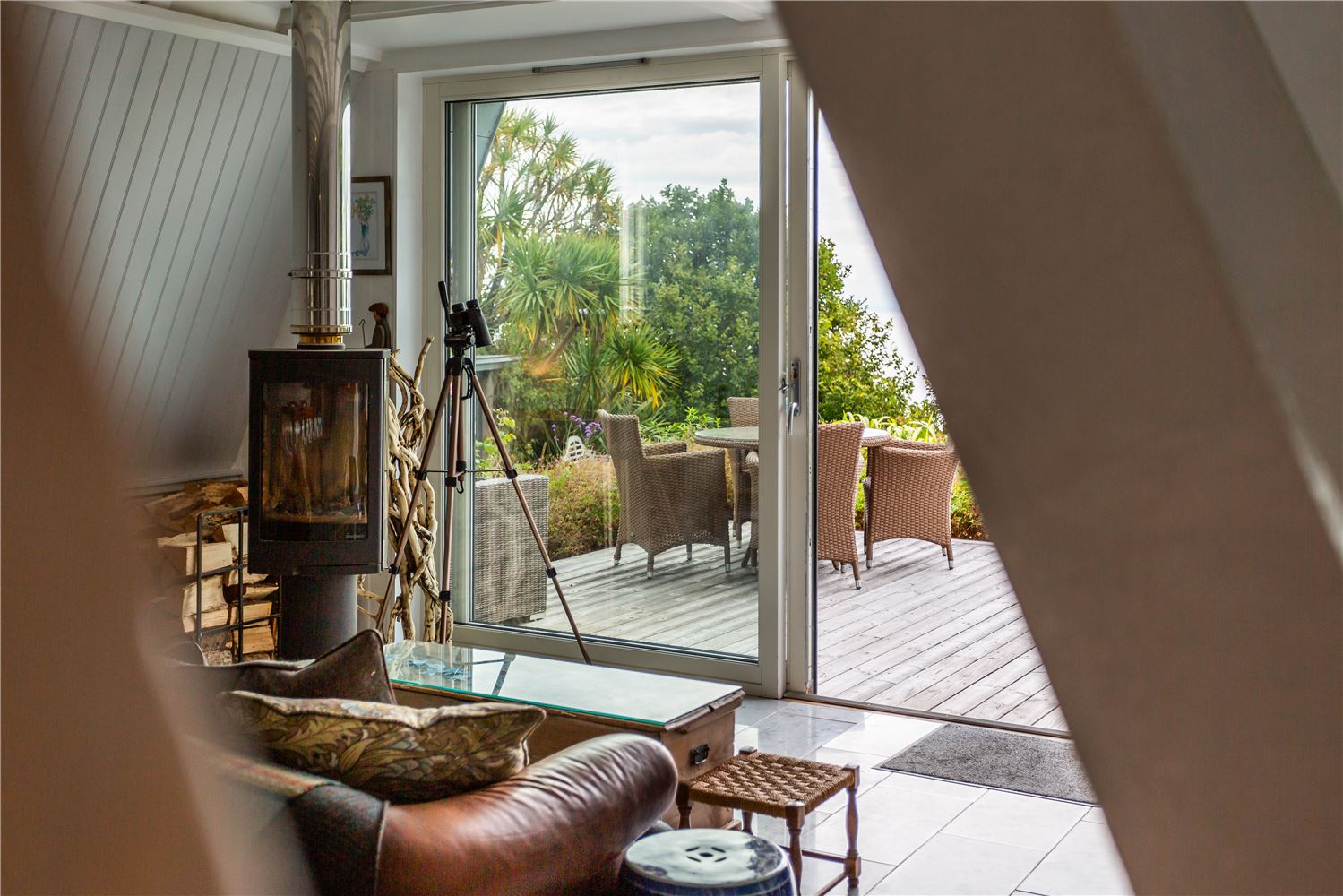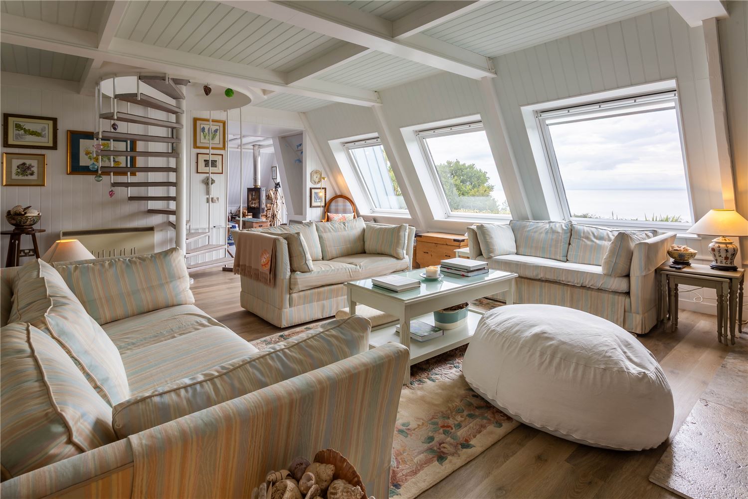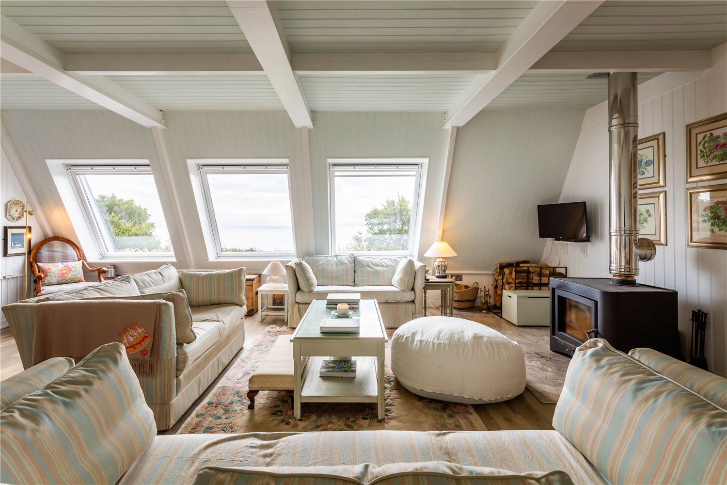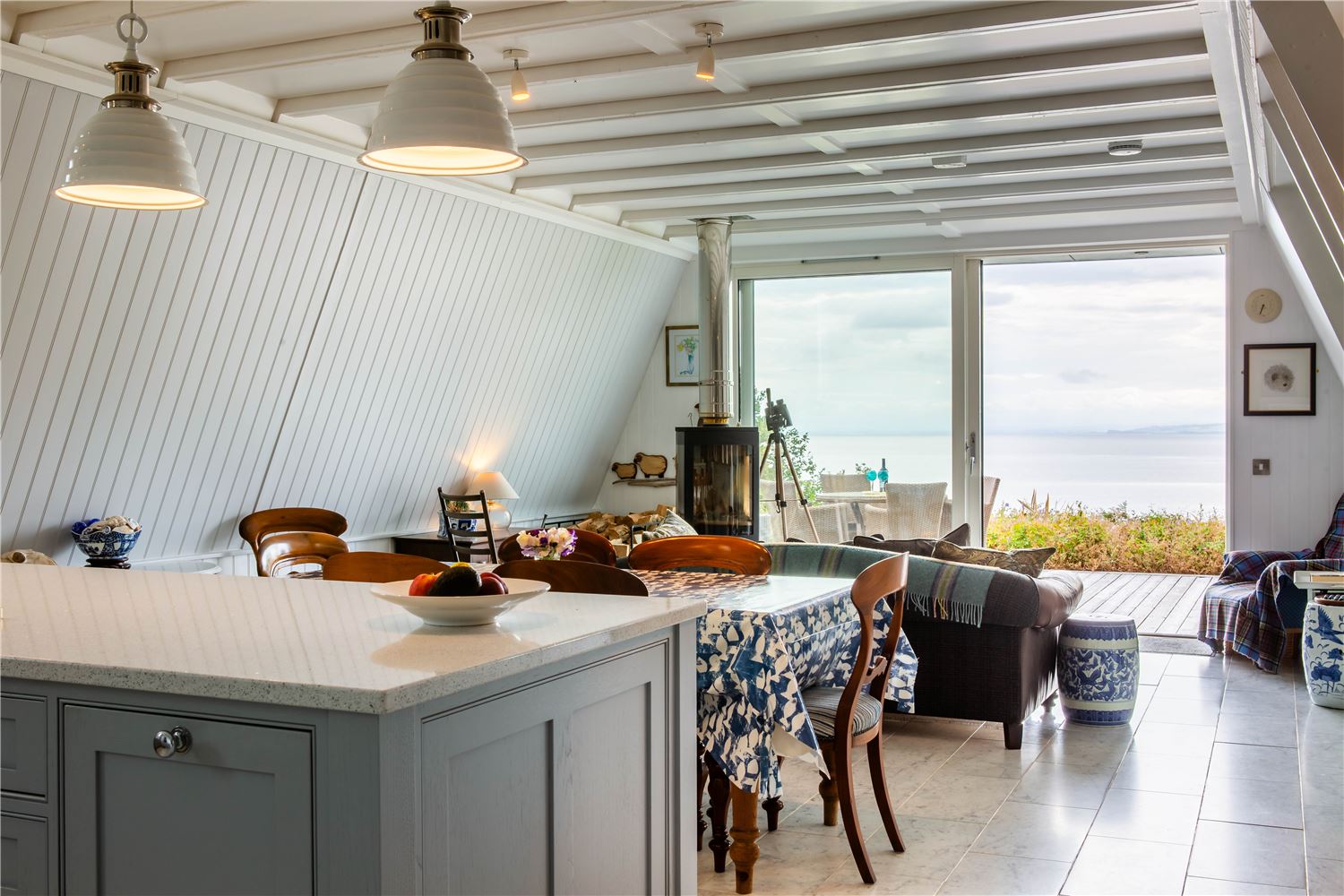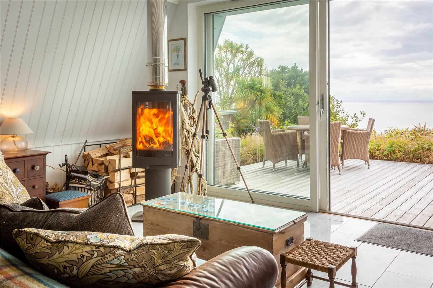 The large sitting room is a peaceful retreat, designed for relaxation with generous, comfortable seating, a second wood-burning stove, and floor-to-ceiling windows framing uninterrupted coastal vistas.